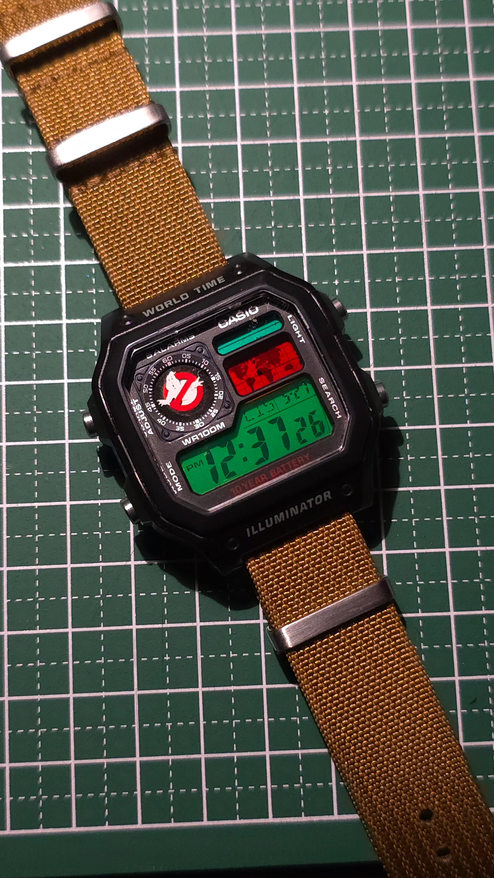 This custom Casio is a full-on proton pack for your wrist. The Ghostbusters logo takes over the circle window, backed by a green time display and a red map. Just like the Ecto-1’s warning lights.