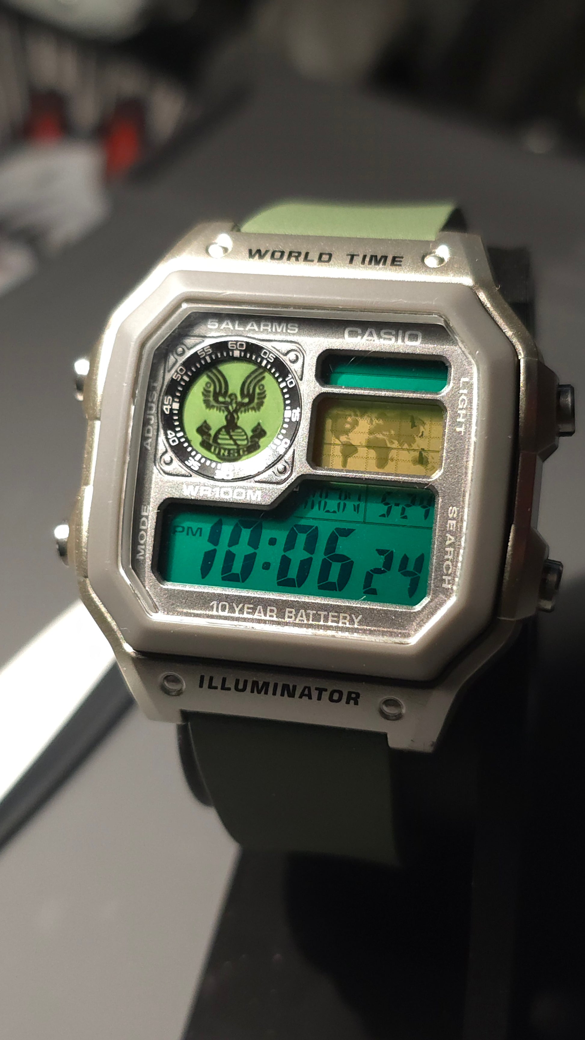 This custom Casio is built like Mjolnir armor for your wrist. The UNSC Marine logo sits in the top circle, paired with a bold green time window that calls back to Chief’s iconic visor. The orange map and green notification displays tie the design together with a distinctly military feel.