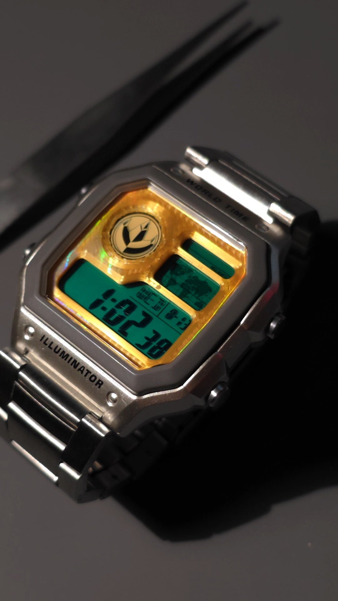 This custom Casio carries a polished stainless steel body with a gold holographic faceplate that shifts and reflects in the light. At its center, the Green Ranger’s Power Coin stands bold, giving the watch a commanding focal point.