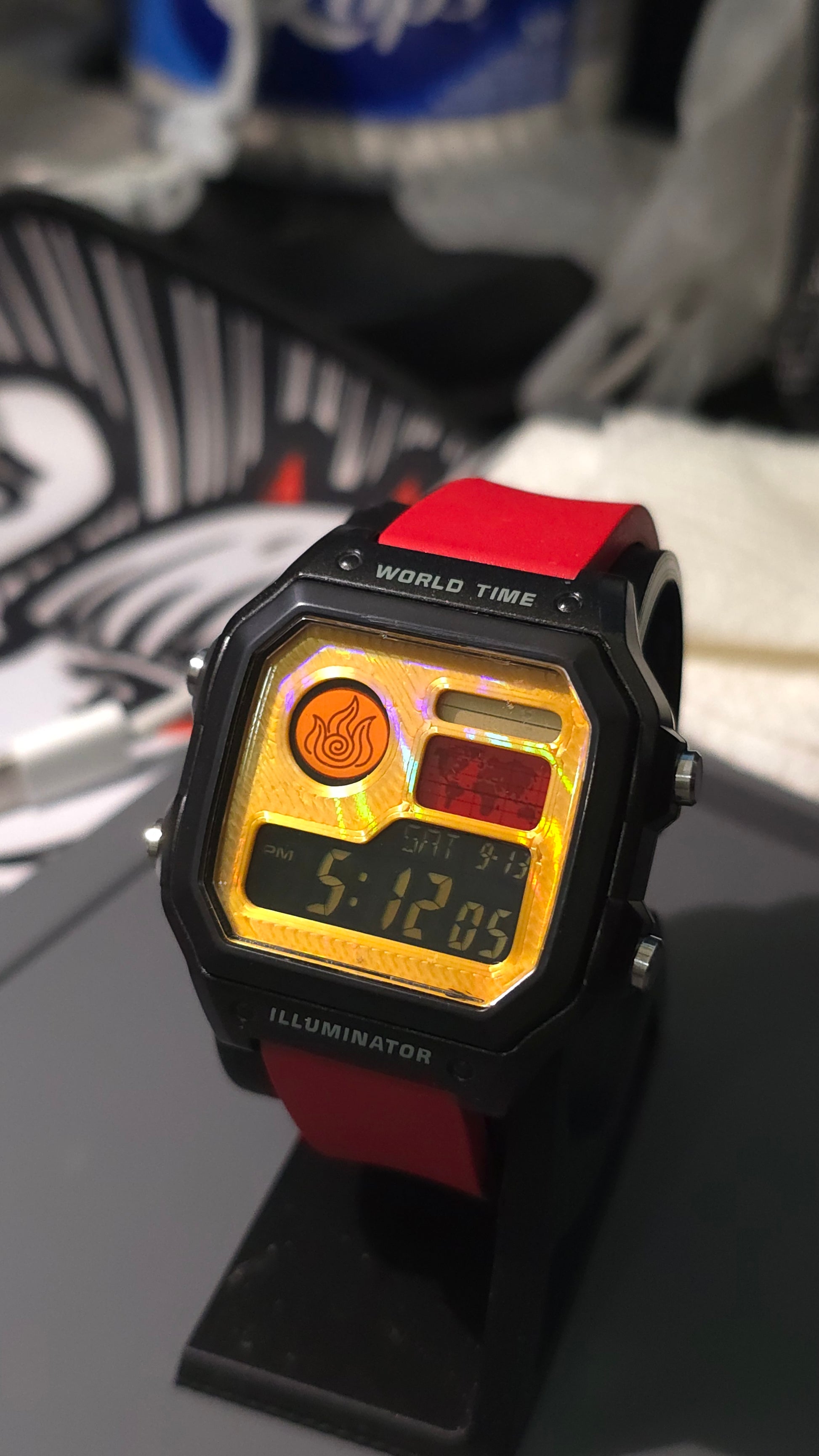 This custom blacked-out Casio is for those who’ve walked through the fire and come out stronger. The watch face is fitted with a custom gold plate and the Fire Nation insignia in the top circle, framed by a red resin strap worthy of royalty. The negative display gives the time a shadowy edge, with a blazing red map window and a fiery orange notification window tying it all together.