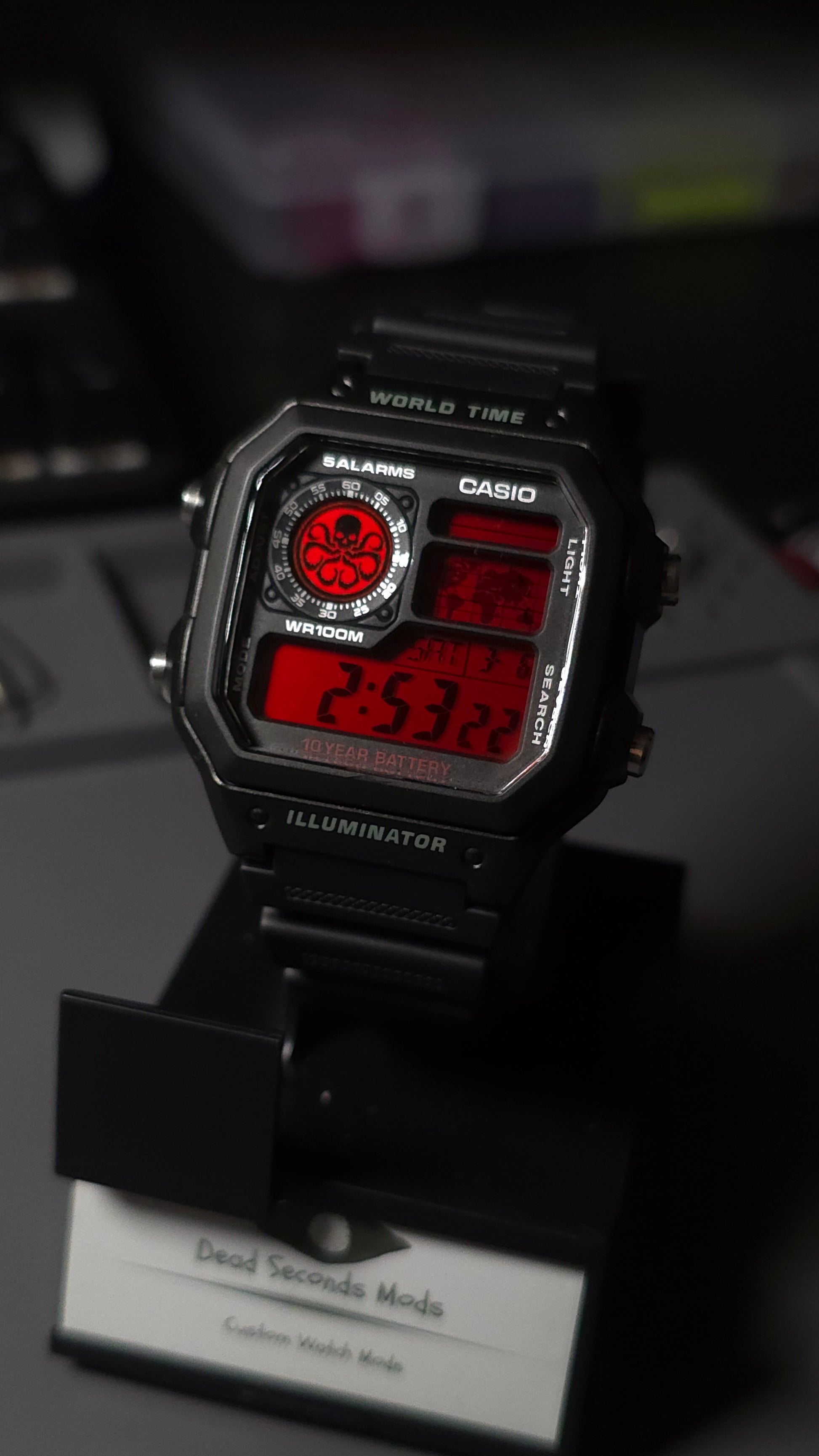 Matte black case with the Hydra emblem stamped into the subdial, blood-red LCD flooding the display like a warning siren. The world map burns beneath the surface, stark and militant, built to feel less like a watch and more like a symbol.