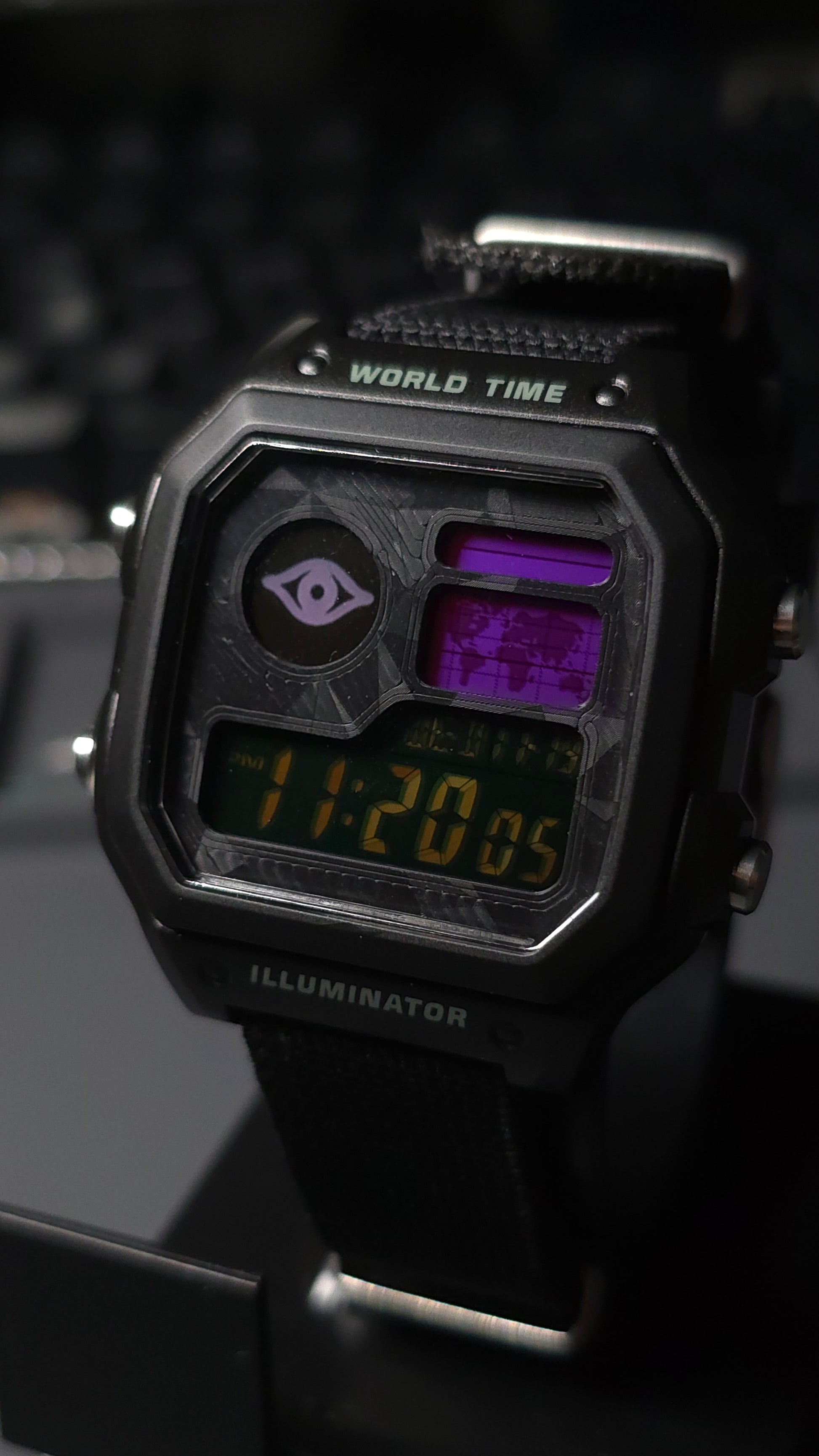 A blackout case with the Royal Hunter insignia sealed into the circle, violet windows across the display, and a faceplate patterned like arcane surveillance tech built to look like it came straight out of the Order’s archives.