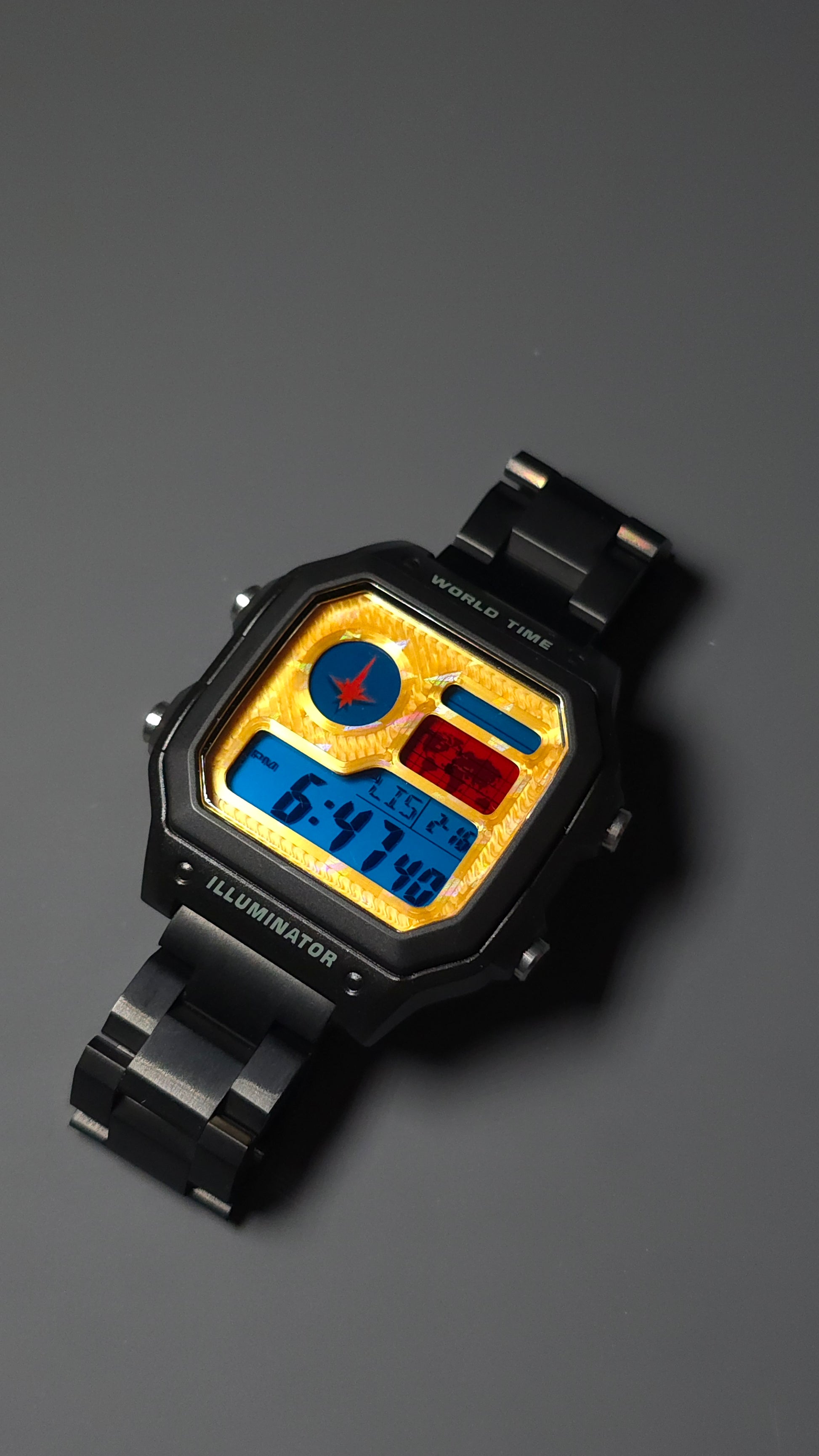 A burnished gold frame lit with that deep cosmic blue, built to feel like a fragment of the Nova Force itself. The central emblem blazes like a miniature supernova, red accents pulsing like warning flares before a light-speed drop. Clean lines, military symmetry. The kind of piece that looks issued, not crafted, like something the Corps would lock behind Worldmind authorization.
