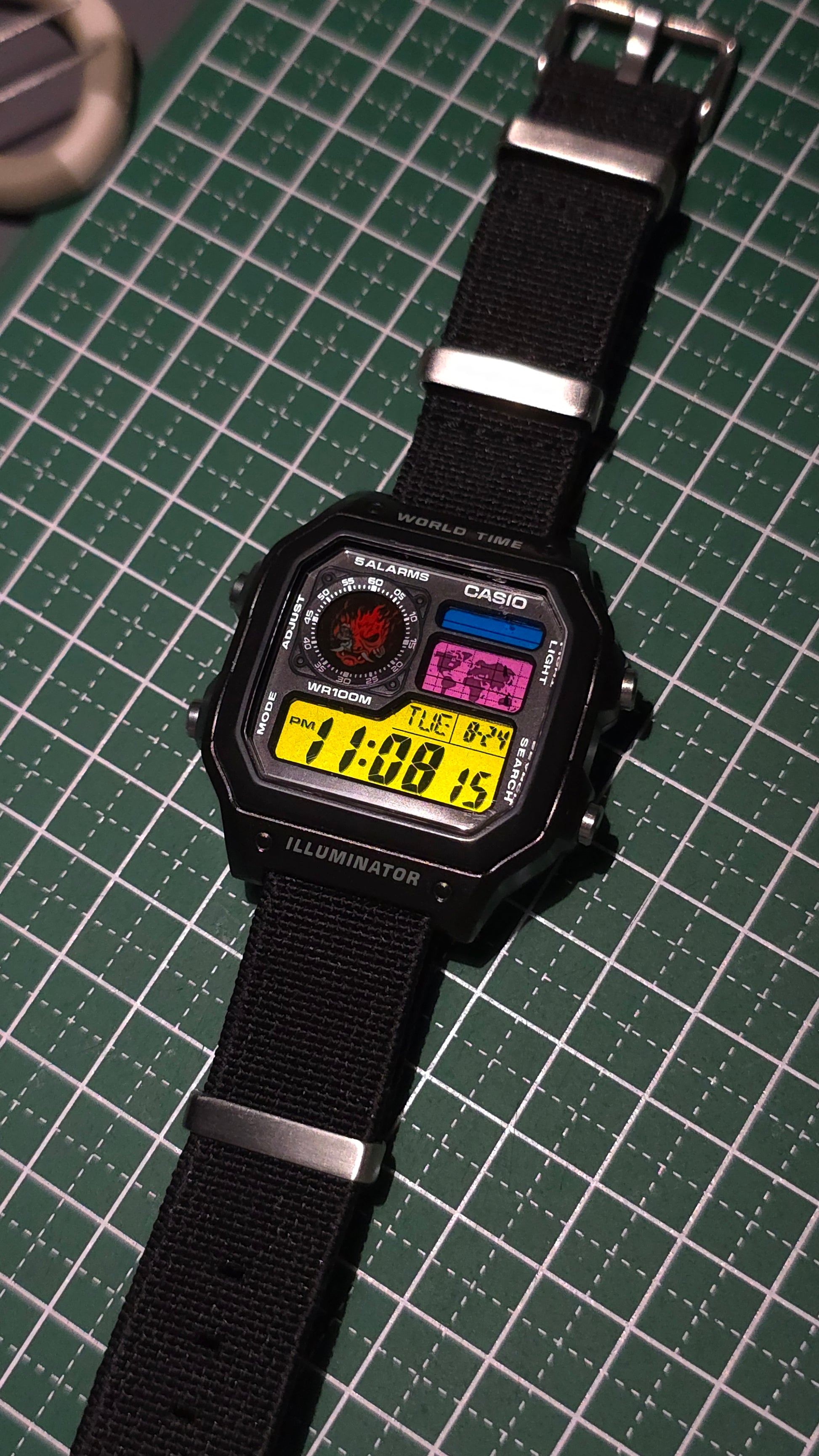 Bright yellow. Electric blue. Synthetic pink. This watch hums like a neon artery under the city lights. A reminder that chrome fades, but time doesn’t. The demon on the dial isn’t decoration. It’s the cost of staying alive.