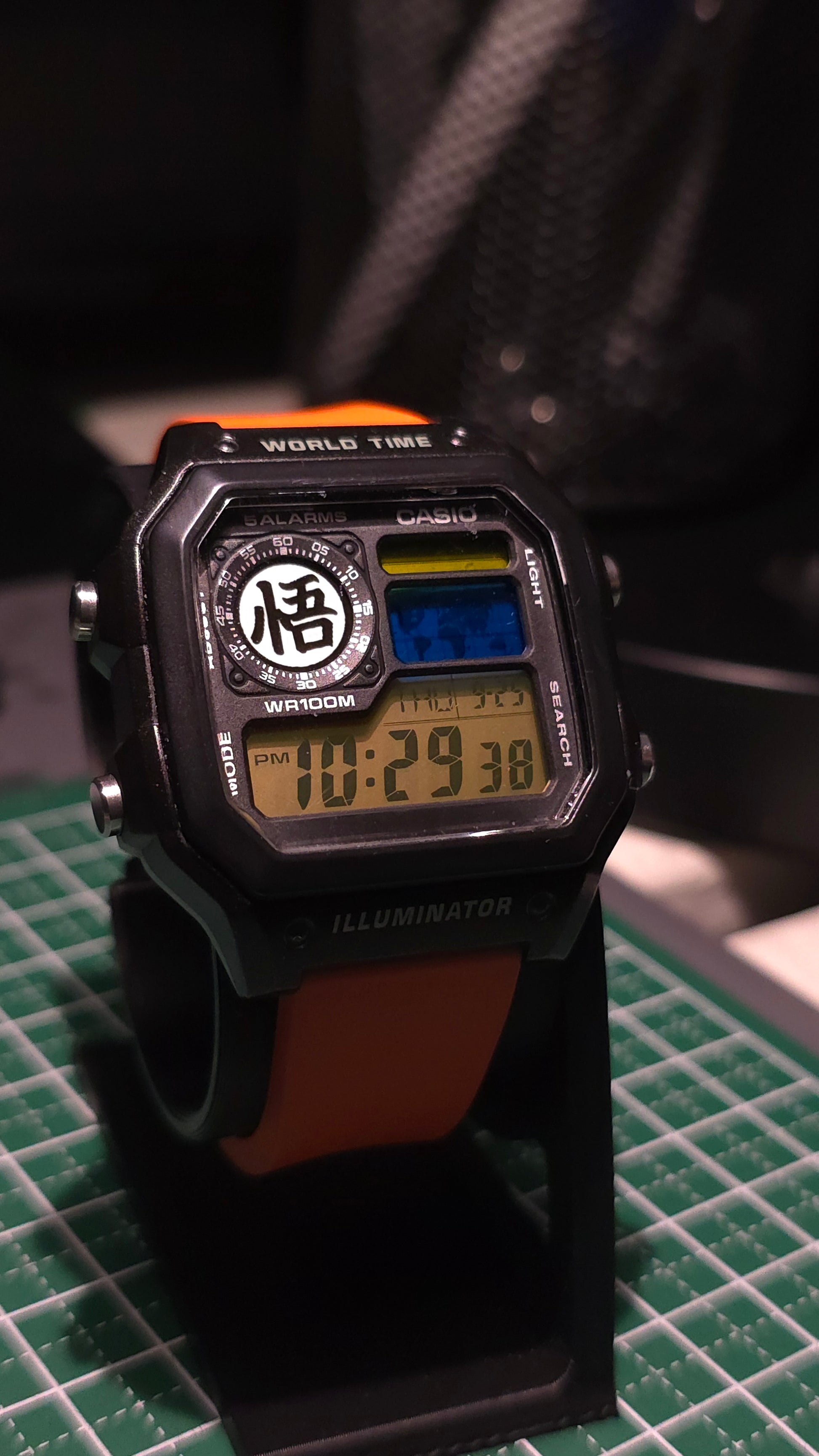 This design captures the energy of Earth’s greatest warrior. The bold black case frames a clean, high-contrast display, with the orange resin strap calling back to Goku’s iconic gi. The upper left circle features his “悟” (Go) symbol, worn proudly on his uniform during training and battle.