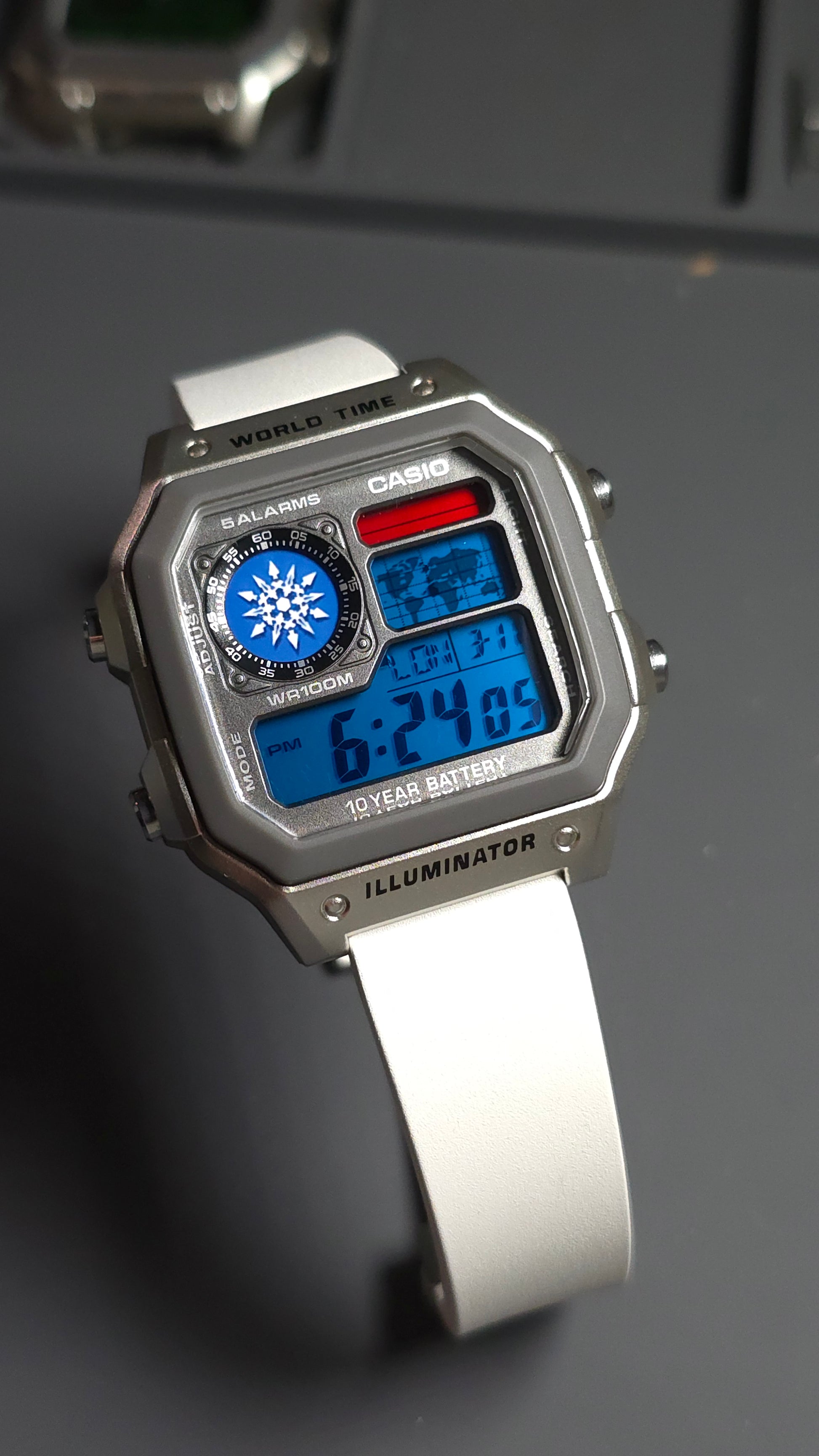 Polished silver case with icy blue illumination, a crisp white strap, and the Schnee snowflake set clean in the subdial like a family crest carved from frost. The world map glows cold and precise, while the blue LCD keeps everything sharp, controlled, and unyielding.