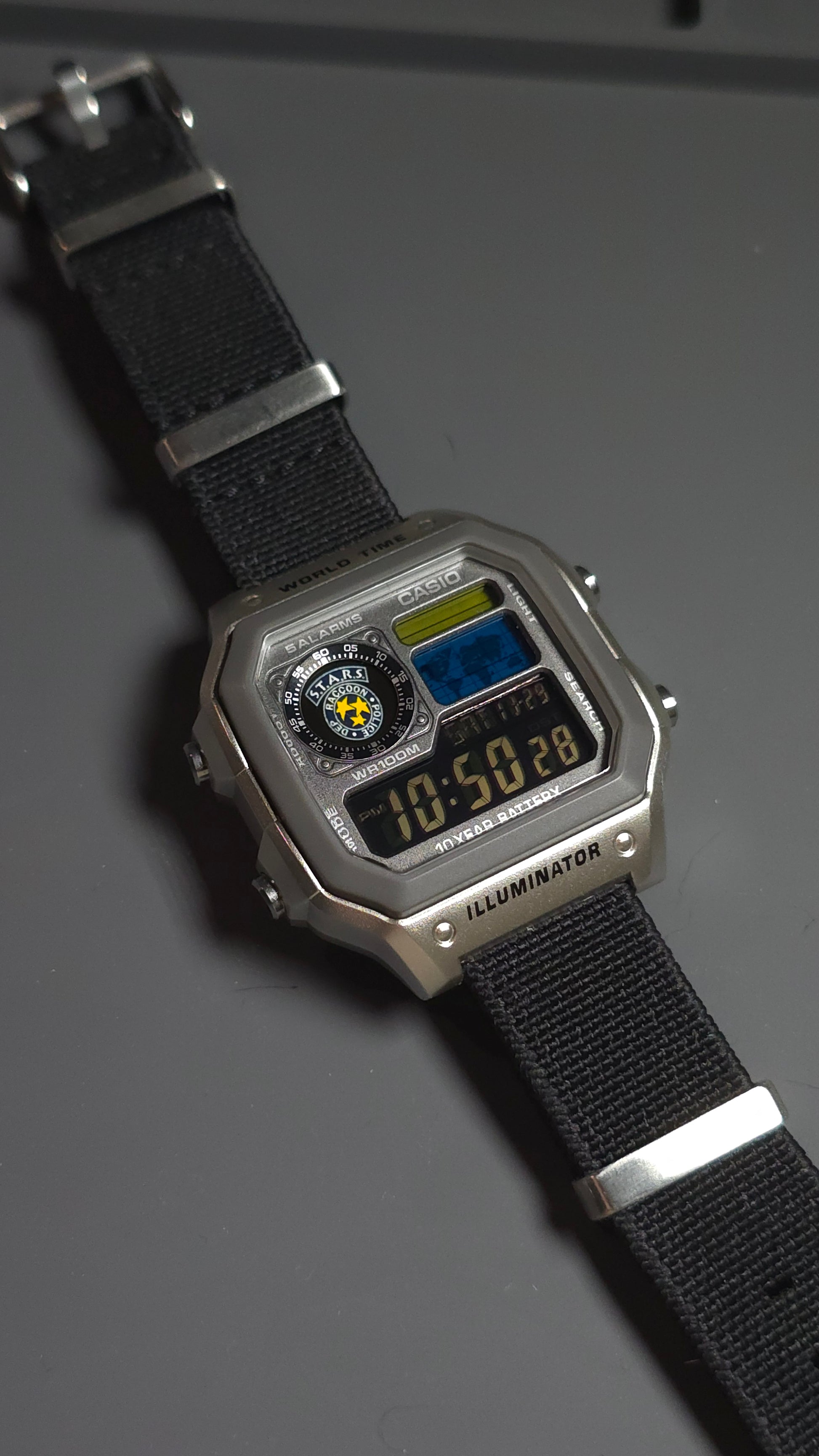 Cold silver case like a battered S.T.A.R.S. sidearm, with deep blue and yellow windows pulled straight from Raccoon City’s tactical palette. The badge sits in the dial like an issued ID patch. Clean, official, and just a little ominous once the lights go low.